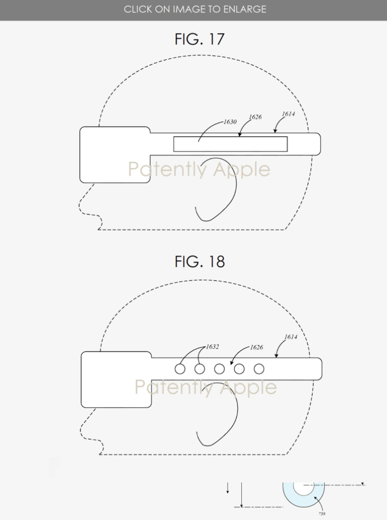 苹果专利图17和图18是侧面、平面图的替代实施例的可穿戴支持与音频组件一起使用。