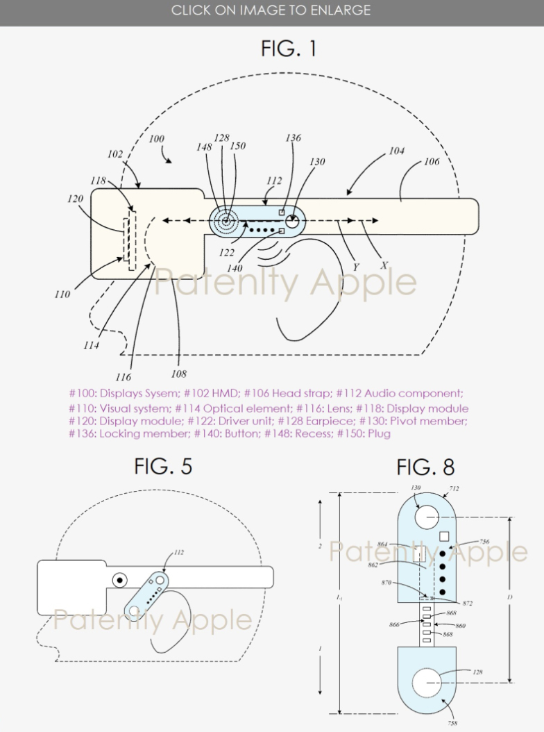 苹果的专利图5是可穿戴显示系统的侧面平面图,表示音频组件在混合模式下的操作,该模式允许声音的听觉内和听觉外投影;图8是音频组件的侧面、平面图,表示第二(细长)配置。